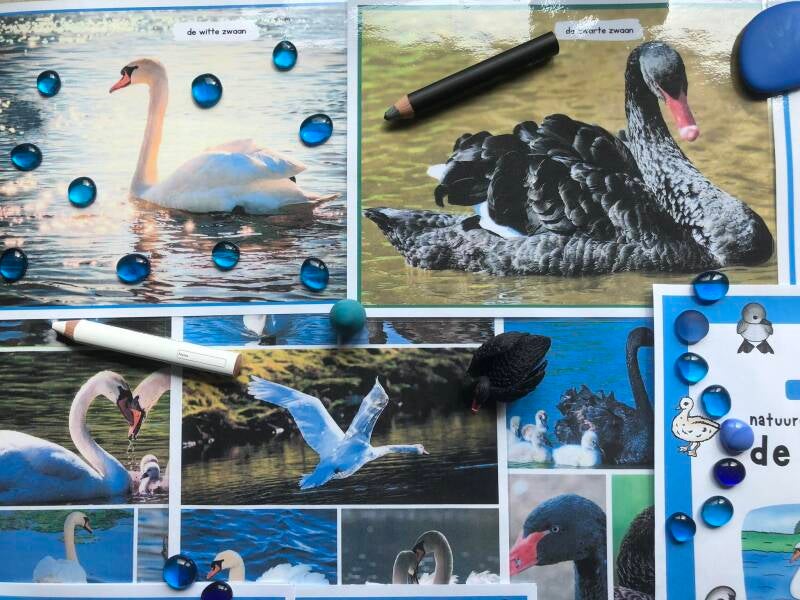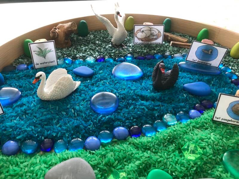 De witte en zwarte zwaan op het meer zijn van 'Schleich' en de zwaan met haar vleugels open is van 'Papo'                    De leuke potloden zijn van Lamy en Woody Stabilo                                                                                                      Daarnaast zie je ook nog EDX regenboog stenen, decoratie glasstenen en grapat in de sensory bin